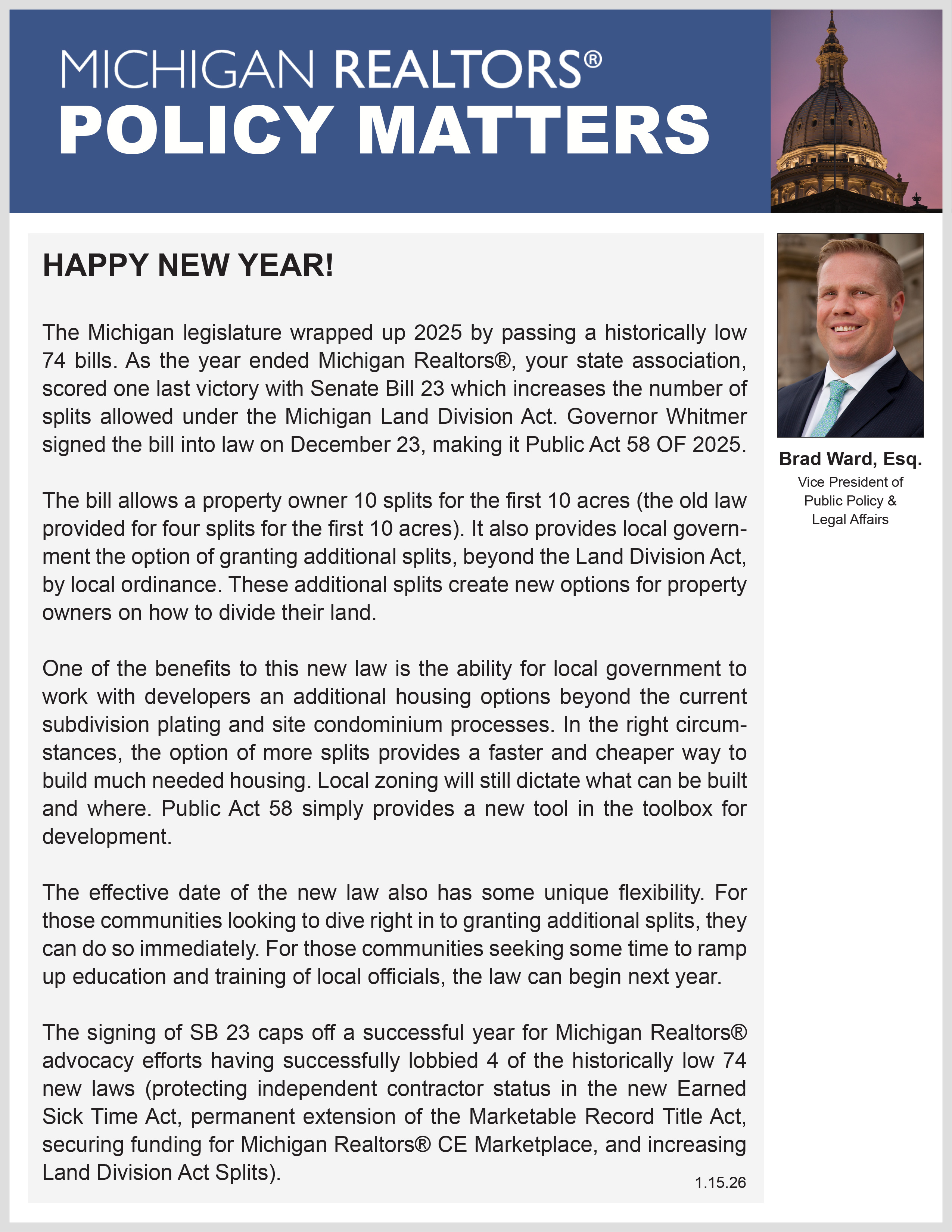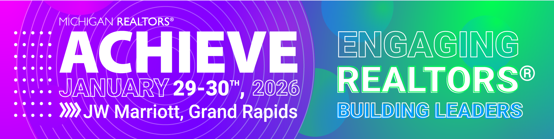 My first “ask” as your 2026 President is simple: Join our community and let’s continue the conversation. If you’re interested in meeting some like-minded and motivated Realtors® in Michigan, make plans to attend the 2026 Achieve Leadership Conference on January 29-30 in Grand Rapids. Achieve provides leaders of every level with the tools needed to be part of the change they want to see in their local associations, offices and communities. The event gathers the best and brightest association leaders and public policy advocates from across Michigan.